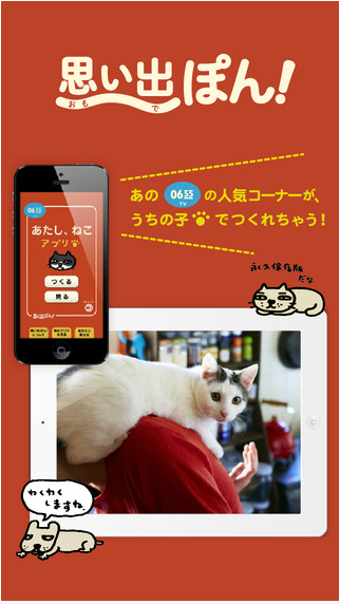 スライドショー作成アプリ「あたし、ねこ」思い出ぽん!は、自慢の猫をスライドショーで紹介するアプリです。なかなか思い通りの写真を撮らせてくれないからこそ、撮れた時の1枚は誰かに自慢したくなるもの。アプリを開いて「つくる」をタップして、とっておきの写真を選んで「ぽん!」。できたスライドショーは、NHKのEテレ「0655」のコーナーで流れる、「あたし、ねこ」をBGMにフォトムービーとして楽しめます。また、作成したスライドショーは思い出ぽん!に応募すると、紹介ページで掲載されるチャンスもあるのでベストショットを多くの人に見てもらえるかもしれません。